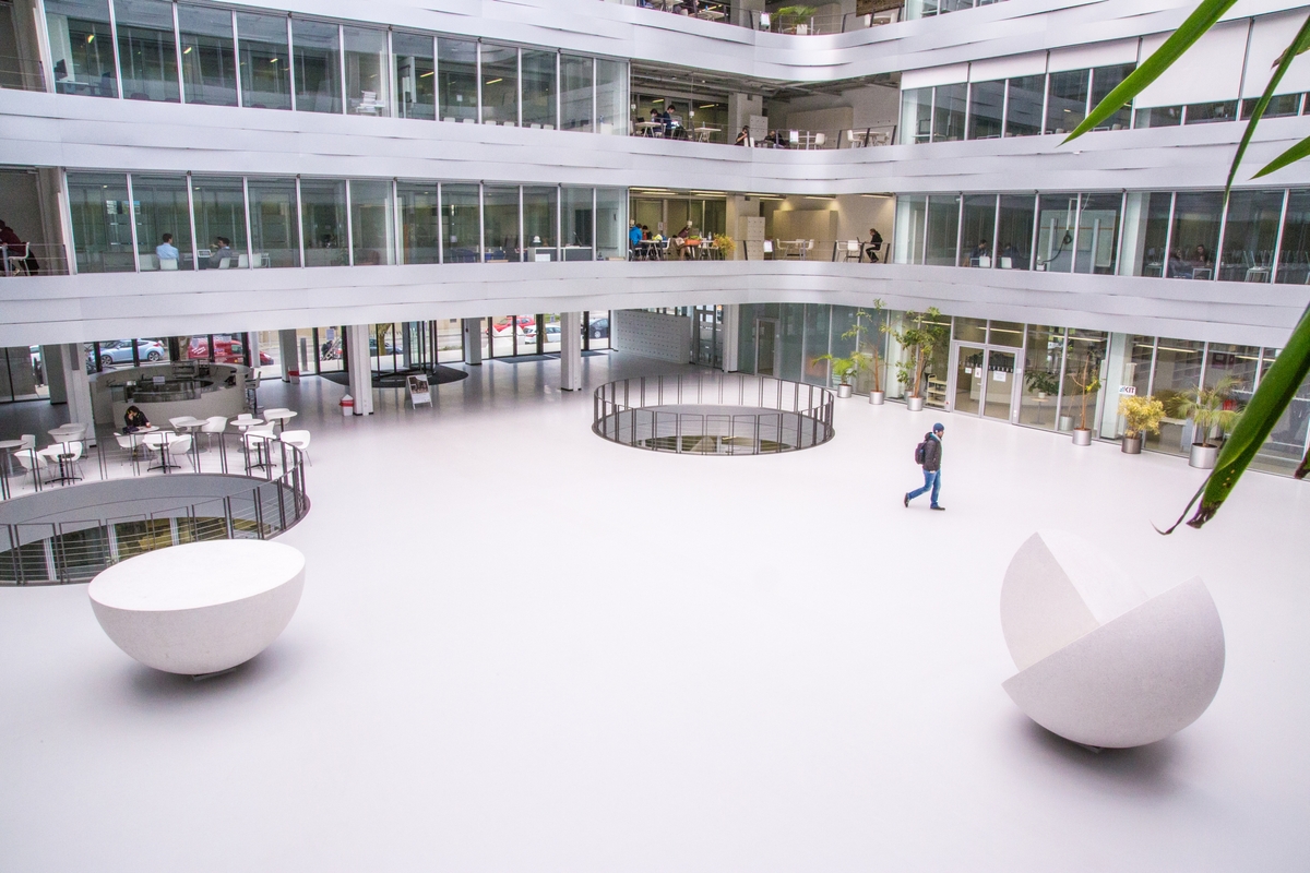 Der helle, überdachte Innenhof des Kollegiengebäudes Mathematik (Bild: KIT)