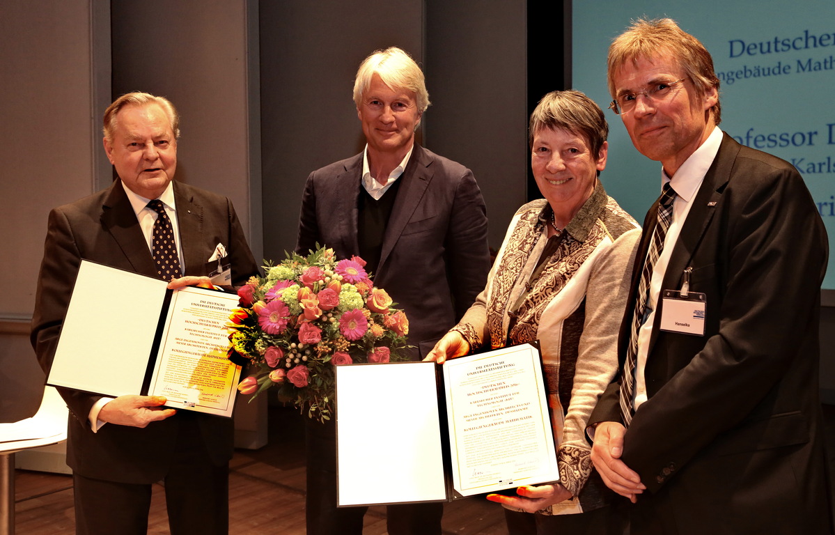 v.l.: Dr. Wickert, stellvertretender Vorsitzender der Eberhard-Schöck-Stiftung, Architekt Ingenhoven, BM Dr. Hendricks, Präsident Hanselka (Quelle: Deutscher Hochschulverband, Foto: Kornelia Danetzki)