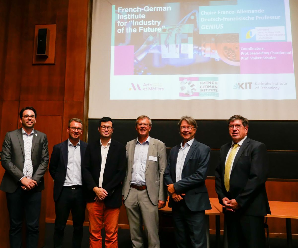 Dr. Paul Stief, Arts et Métiers Metz und wissenschaftlicher Leiter von GENIUS; Dr. Udo Thelen, Generalsekretär der DFH; Prof. Jean-Rémy Chardonnet, Arts et Métiers Chalon-sur-Saône; Prof. Volker Schulze, KIT; Prof. Ivan Iordanoff, Direktor für Forschung und Innovation bei Arts et Métiers; Prof. Thomas Hirth, Vizepräsident Transfer und Internationales des KIT (v. l. n. r.).