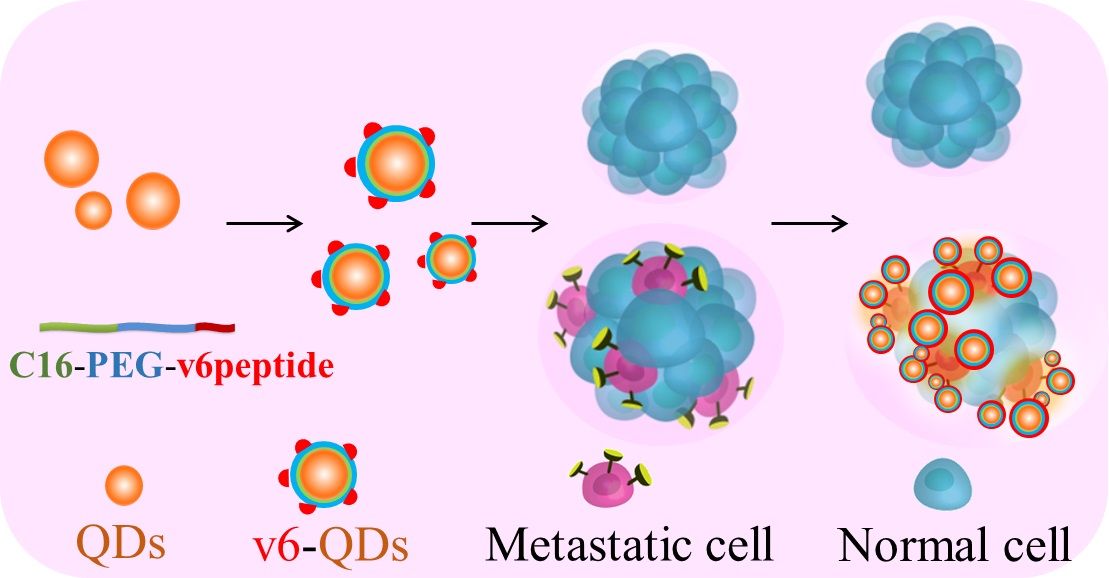 Um die Krebszellen aufzuspüren, die CD44v6 exprimieren, setzte die Forschergruppe „Biofunctional Materials“ unter Leitung von Dr. Pavel Levkin am Institut für Toxikologie und Genetik (ITG) und am Institut für Organische Chemie in Kooperation mit Professorin Véronique Orian-Rousseau vom ITG des KIT die v6-Peptide – kleine Abschnitte von CD44v6, die aus fünf Aminosäuren bestehen – in abgewandelter Version ein: Die Wissenschaftler nutzen fluoreszierende Quantenpunkte – Nanokristalle mit extrem kleinem Durchmesser –, die sie an ihrer Oberfläche durch v6-Peptide abwandelten, das heißt funktionalisierten, um so die Krebszellen zu entdecken. Die fluoreszierenden Quantenpunkte binden spezifisch an CD44v6 exprimierende Zellen und färben diese ein. Das gelang sowohl in Zellkulturen als auch in Tumorgeweben. „Diese Strukturen besitzen damit ein hohes Potenzial für die Entwicklung und Verbesserung von Nanotransportern zur Diagnose“, erklärt Pavel Levkin.