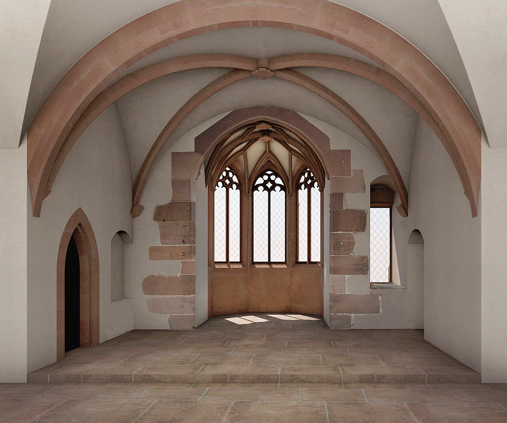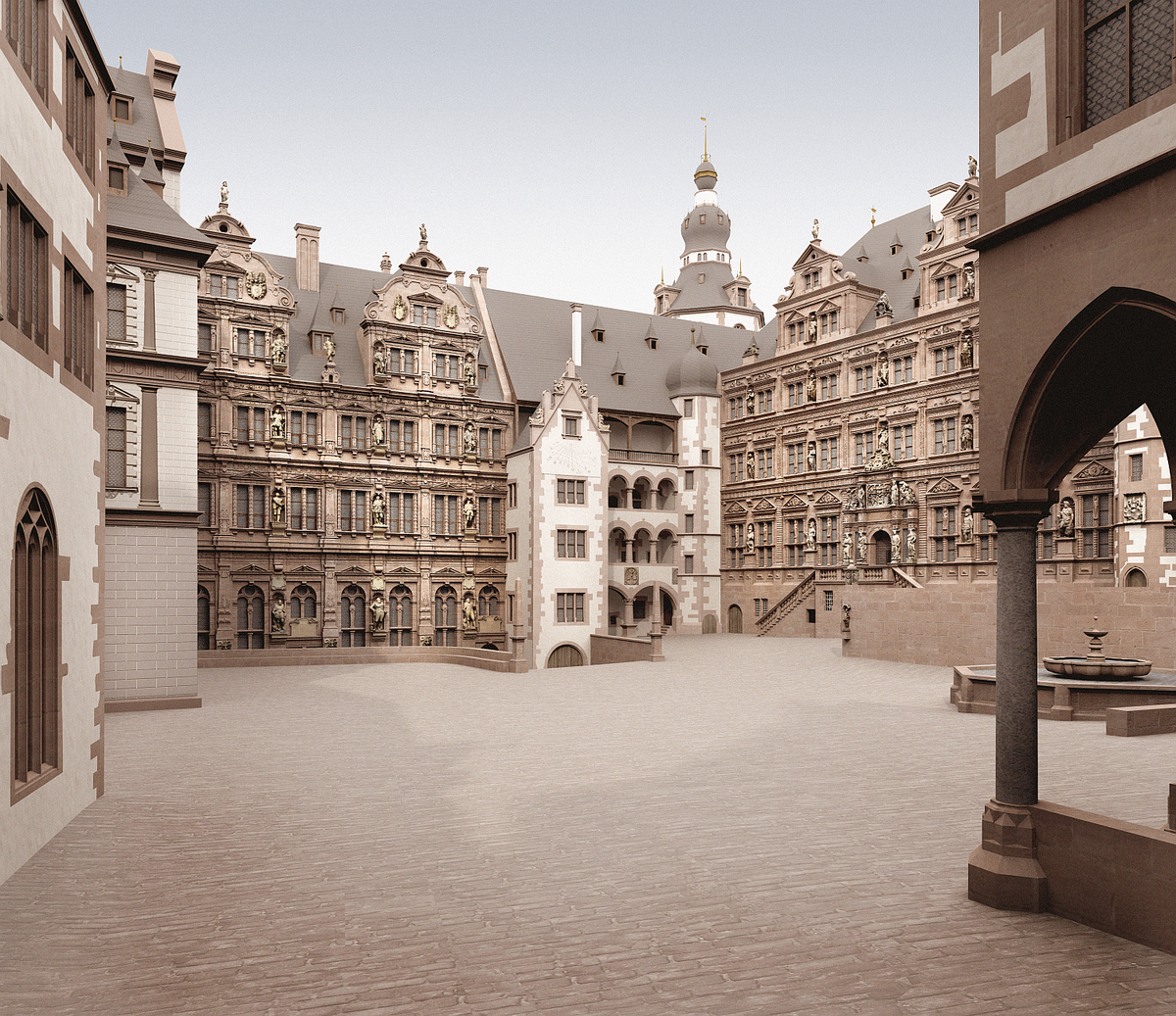 Wo nunmehr leere Fensterhöhlen auf das malerische Neckartal blicken und mit Efeu überwucherte Mauerreste wie Klippen schroff in den Himmel ragen, kann der Besucher in der Simulation von Julian Hanschke vom Institut für Kunst- und Baugeschichte am KIT den einst wuchtigen, dann zur Hälfte weggesprengten Dicken Turm besteigen, unter den Kreuzgratgewölben des Kaisersaals im Ottheinrichbau umherspazieren, den Figurenschmuck an der Fassade des an einen venezianischen Palazzo erinnernden Friedrichsbau betrachten oder den 360-Grad-Blick durch den Schlosshof im Jahre 1683 schweifen lassen.