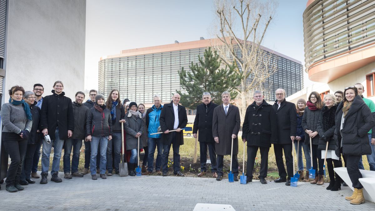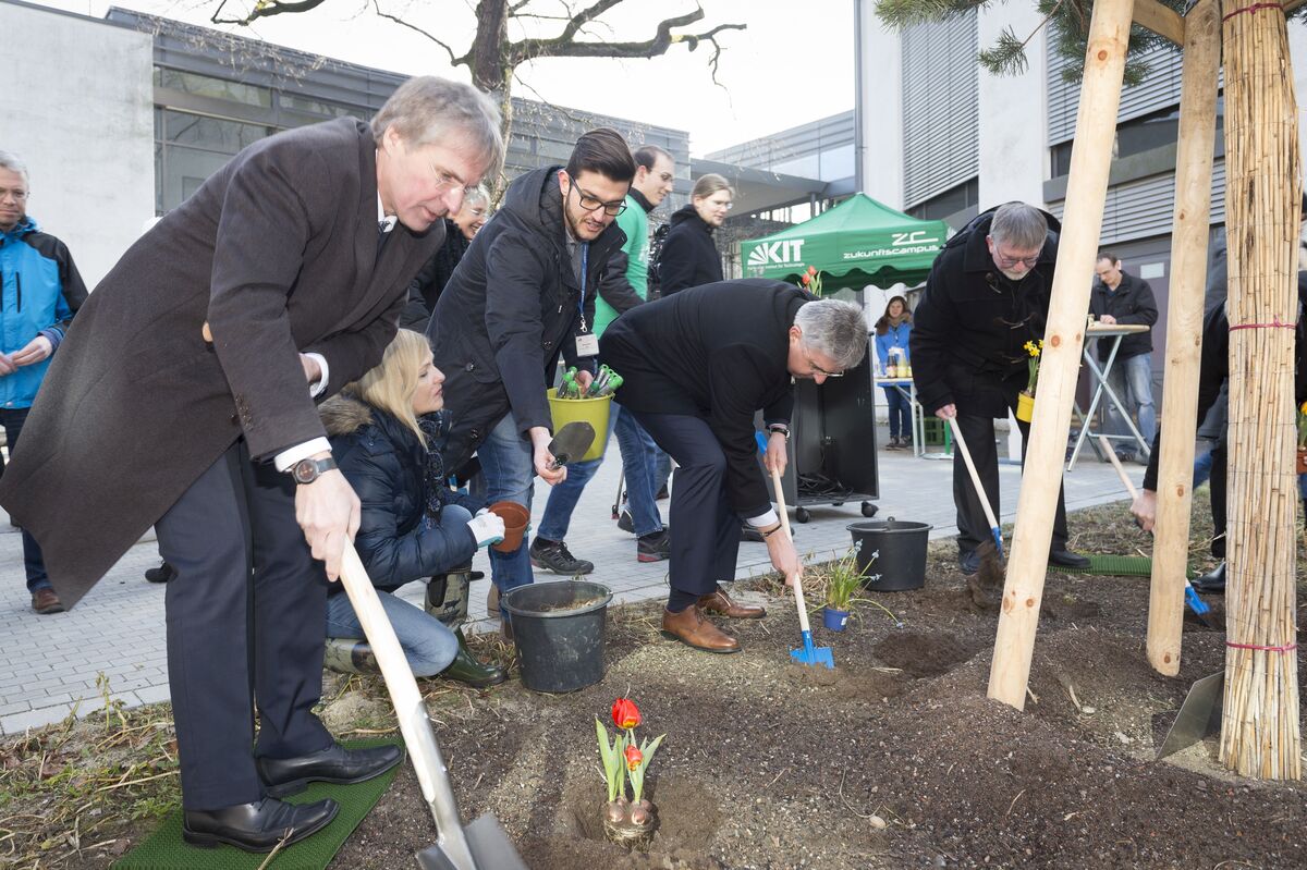 Als Symbol für seine ambitionierten Ziele widmet das KIT der nachhaltigen Campusentwicklung auf dem Platz zwischen Audimax und dem Materialwissenschaftlichen Zentrum (MZE) einen jungen Baum, samt frühblühender Blumen.