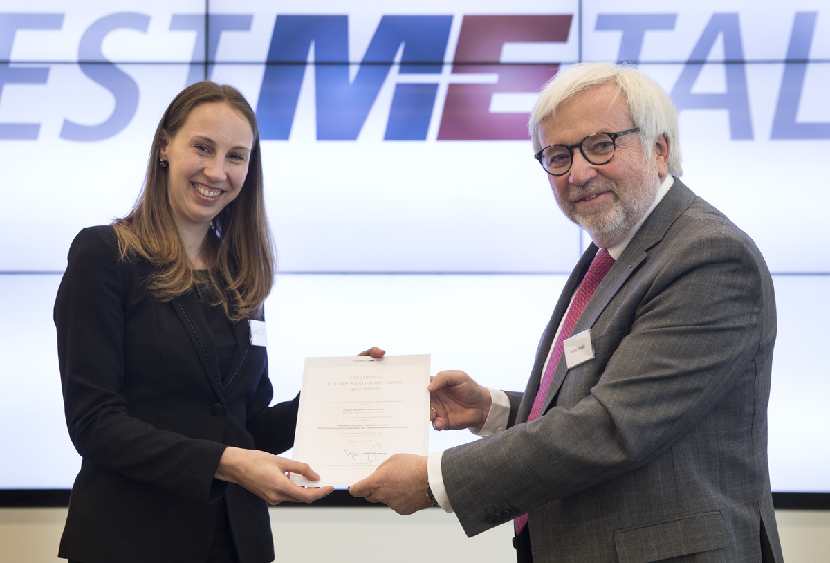 Dr.-Ing. Nicole Stricker nimmt die Urkunde zum Förderpreis aus den Händen des stellvertretenden Südwestmetall-Vorsitzenden Reiner Thede entgegen (Foto: Eppler)