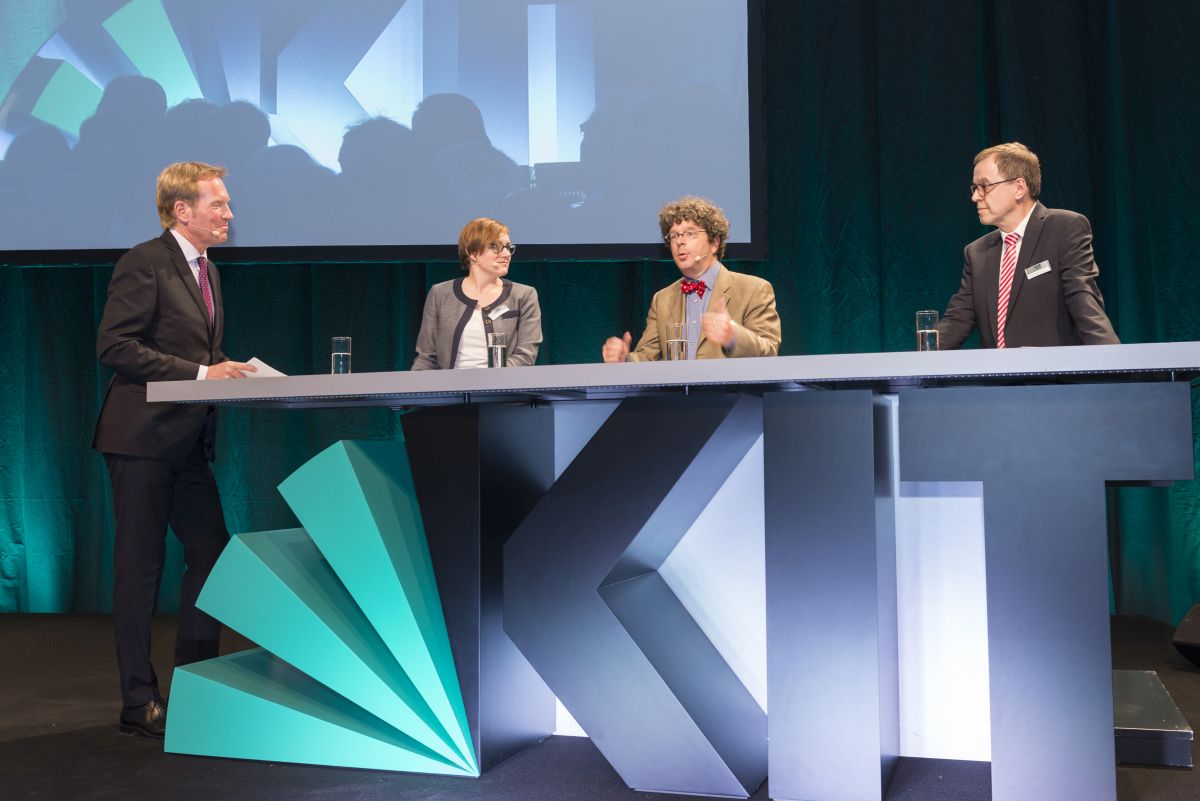 Erfolg durch Vernetzung: Darüber diskutieren Moderator Markus Brock mit Corinna Hoose, Jörn Müller-Quade und Martin Wegener (v. l.; Foto: Laila Tkotz, KIT)