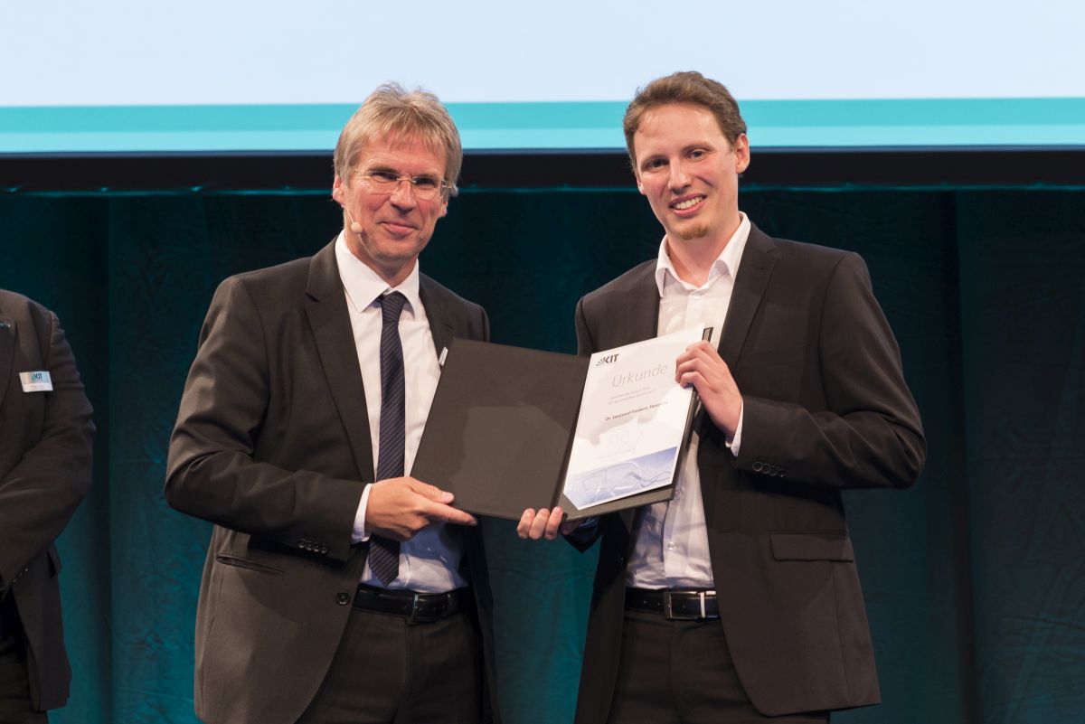 Präsident Holger Hanselka (li.) mit dem Gewinner des Science Pitch, Dr. Leonard Henrichs (Foto: Laila Tkotz, KIT)