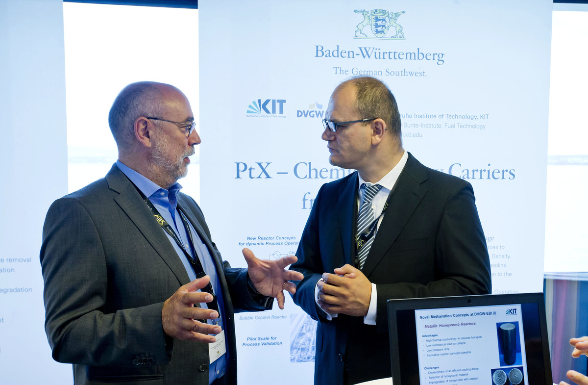 Während der Schifffahrt von Lindau zur Insel Mainau am Freitag, den 30. Juni 2017, dem Abschlusstag der Veranstaltung, hatten 13 Nobelpreisträger sowie rund 420 Nachwuchswissenschaftler aus 78 Ländern Gelegenheit, sich über Forschungsprojekte im Bereich Chemie aus Baden-Württemberg informieren. Auf Einladung des Staatsministeriums zeigte Thomas Kolb Methoden zur alternativen Energiewandlung beziehungsweise Speicherung, darunter den vom Engler-Bunte Institut entwickelten Wabenreaktor zur Herstellung von Methan, mit dessen Hilfe sich Strom aus Wind und Sonne ins Erdgasnetz einspeisen und somit speichern lässt. Der Prozess wird zurzeit im EnergyLab des KIT im Pilotmaßstab in Betrieb genommen. Engelbert Redel, der eine unabhängige Nachwuchsgruppe am KIT leitet, präsentierte seine Forschungen zu Metall-Organischen Gerüstverbindungen (MOFs) auf Oberflächen, sogenannte neuartige hochporöse SURMOFs. Diese Gerüststrukturen sind derzeit eines der aktivsten Gebiete der Chemie mit zahlreichen Anwendungsmöglichkeiten im Bereich der erneuerbaren Energien wie Wasserspaltung, Solarzellen oder Thermoelektrika. SURMOFs bieten noch sehr viel Potenzial etwa in der Entwicklung neuartiger „Energiewandelmaterialien“.