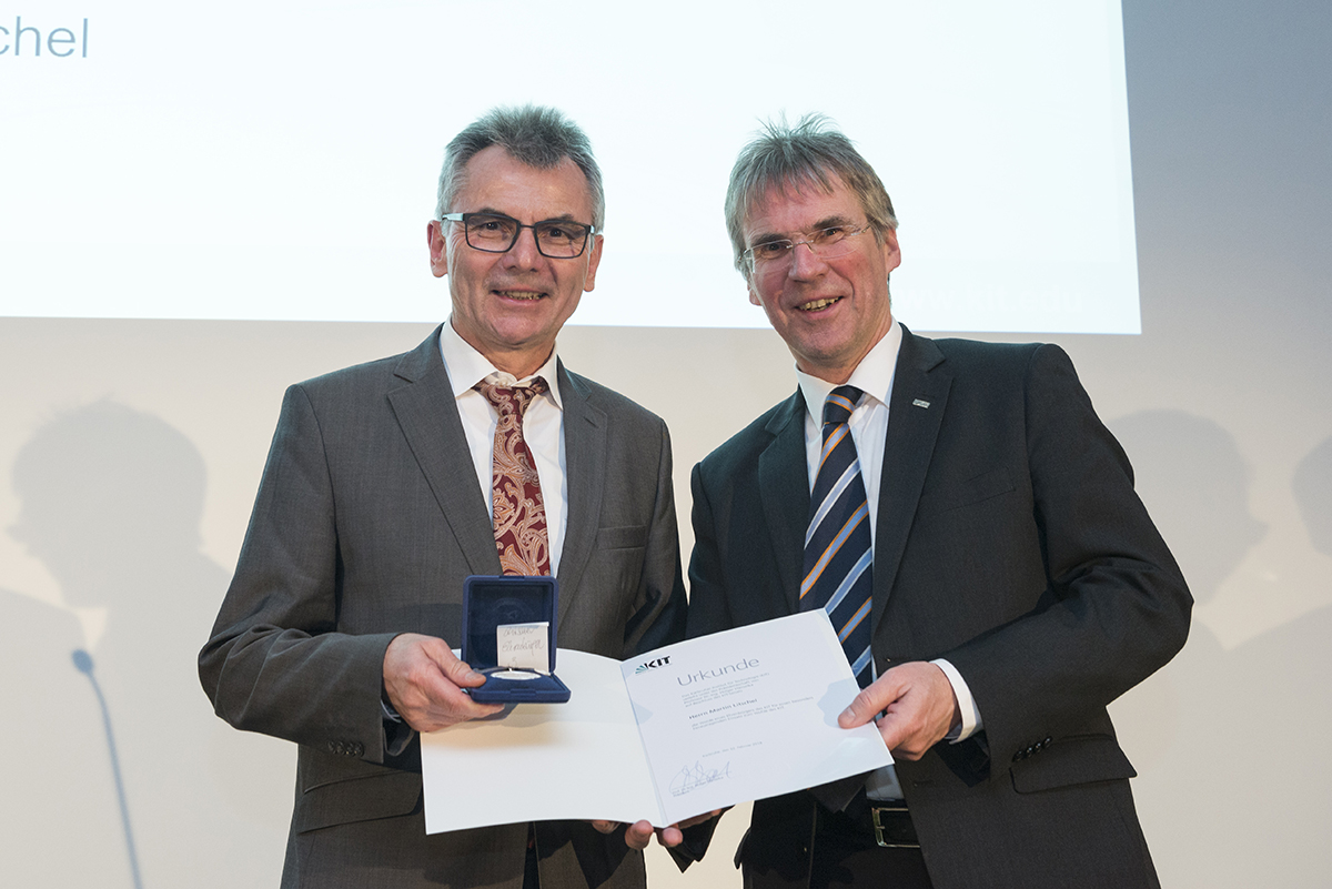 Mit Verdienstmedaillen für ihr außergewöhnliches Engagement würdigte der Präsident des KIT Volker Krebs, ehemaliger Professor und Prorektor für Studium und Lehre der damaligen Universität Karlsruhe (TH), und Wolfgang Müller, Honorarprofessor am KIT und Vorstandsmitglied der BBBank eG Karlsruhe.