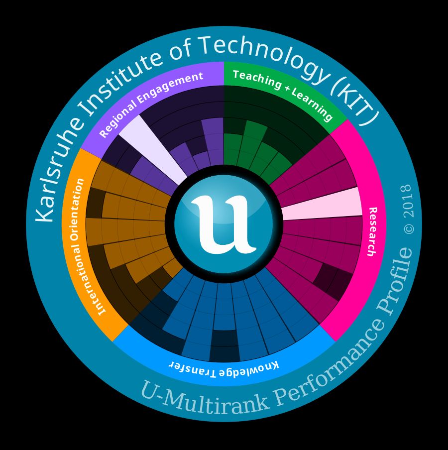 Im aktuellen „U-Multirank“, einer von der EU-Kommission geförderten Auswertung, rangiert das Karlsruher Institut für Technologie (KIT) in den Kategorien Forschung und Wissenstransfer bei einer Reihe von Indikatoren abermals in der Spitzengruppe. So erreicht das KIT in der Kategorie „Wissenstransfer: Erteilte Patente“ im nationalen Vergleich Platz eins vor Freiburg. In der Kategorie „Internationalisierung: Internationale akademische Mitarbeiter“ belegt das KIT Platz zwei hinter der TU München. Kernfachbereiche des KIT wurden für das aktuelle U-Multirank nicht abgefragt.