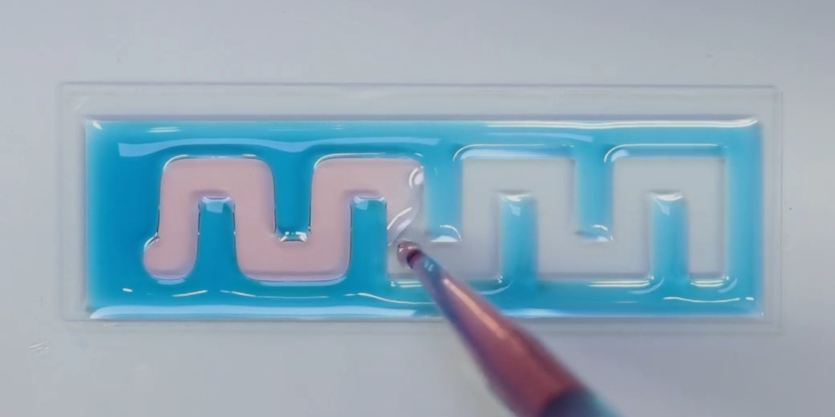 „Die flüssigen Gefäße werden chemisch durch Glasoberflächen mit wasserliebenden und wasserabstoßenden Arealen ermöglicht“, beschreibt das Forschungsteam um Johannes Scheiger und Mariia Kuzina vom Institut für Biologische und Chemische Systeme des KIT den Aufbau. Dazu werden photochemisch Moleküle räumlich gezielt an die Oberfläche gebunden, die mit Wasser stark (wasserliebend) oder schwach (wasserabweisend) wechselwirken.