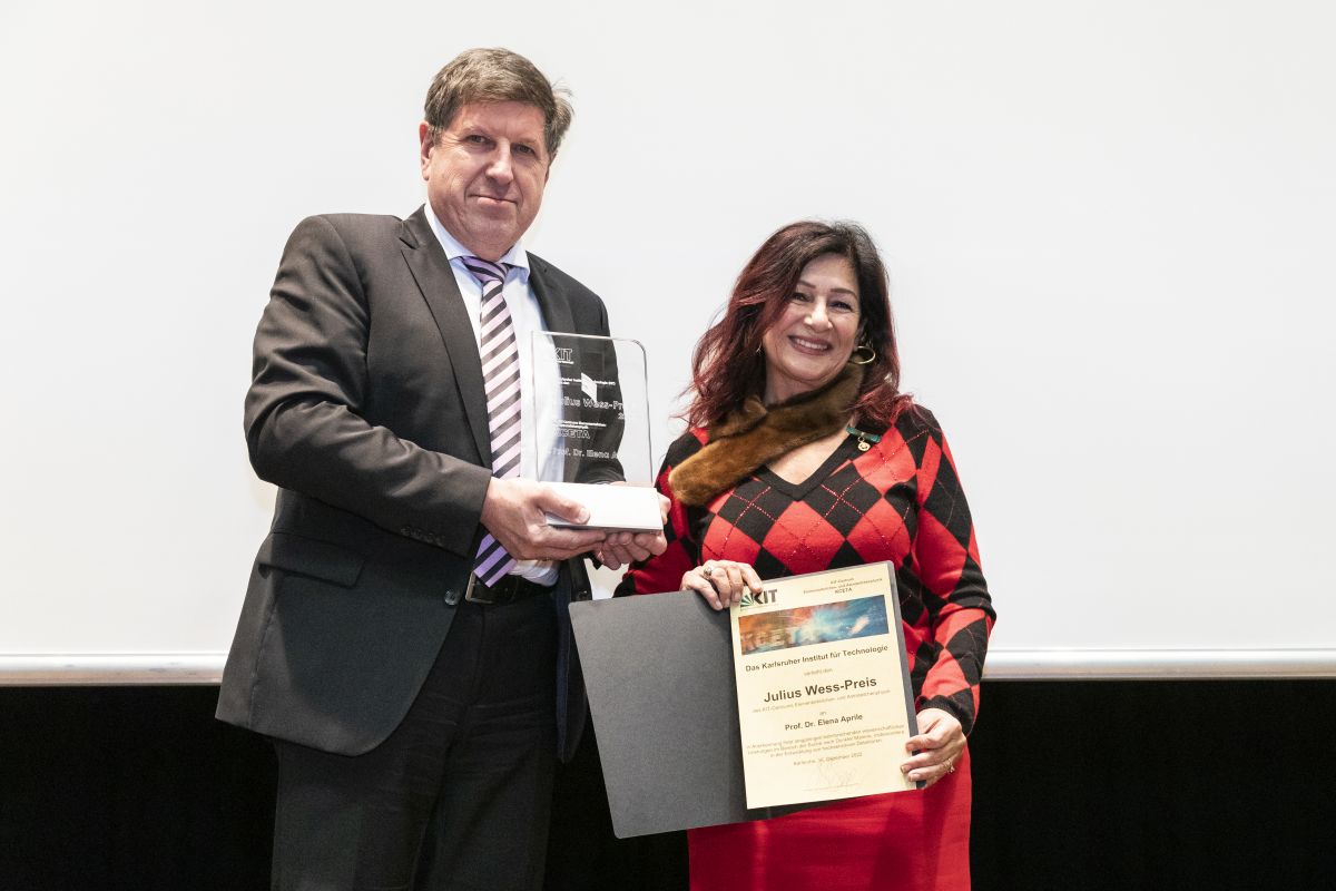 Der Julius Wess-Preis 2022 des KIT-Zentrums Elementarteilchen- und Astroteilchenphysik ging an Elena Aprile, Professorin für Physik an der Columbia University, New York. Sie erhielt den Preis in Anerkennung ihrer langjährigen bahnbrechenden wissenschaftlichen Leistungen auf dem Gebiet der Suche nach Dunkler Materie, insbesondere der Entwicklung von hochsensitiven Detektoren. Die Preisverleihung fand am 16. Dezember am Campus Nord des Karlsruher Instituts für Technologie (KIT) in der Aula des Fortbildungszentrums für Technik und Umwelt statt.