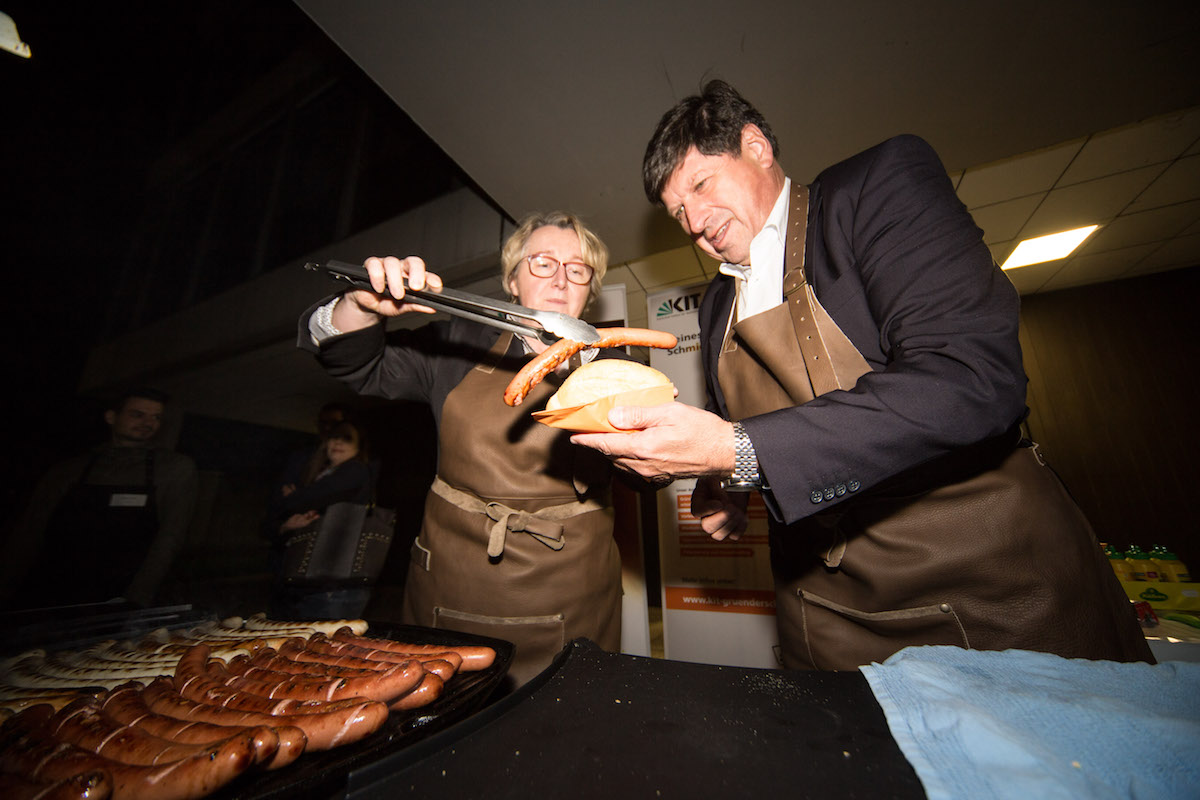Würstchen und Kaltgetränke, Netzwerken und Gründungs- Know-how: Das traditionelle Gründergrillen des KIT ist ein zentraler Treffpunkt für Gründungsinteressierte, Gründerinnen und Gründer, sowie Innovatorinnen und Innovatoren in Karlsruhe. Hier tauscht man Ideen und Tipps aus und trifft Gleichgesinnte. Bei der jüngsten Auflage am 9. Oktober stellte sich Wissenschaftsministerin Theresia Bauer zuerst an den Grill und informierte sich anschließend aus erster Hand über die Karlsruher Gründerszene und ihre Start-ups.