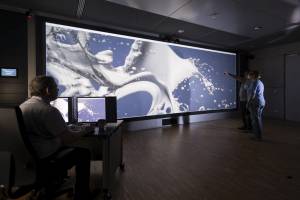 Analysis of an atomized fluid with VR glasses at the virtual test rig. (Photo: KIT)