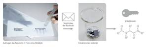 Application of the password in the form of a molecule, sending the message, extracting the molecule, and decryption: The simplified representation above illustrates a highly complex and highly secure method. (Photos: Amadeus Bramsiepe, KIT; graphics: Leon Kühner, KIT)