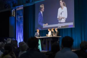 Panel discussion on future working life (from left to right): Presenter Markus Brock, Professor Ingrid Ott, Professor Barbara Deml, Professor Michael Beigl. (Photo: Sandra Göttisheim, KIT)