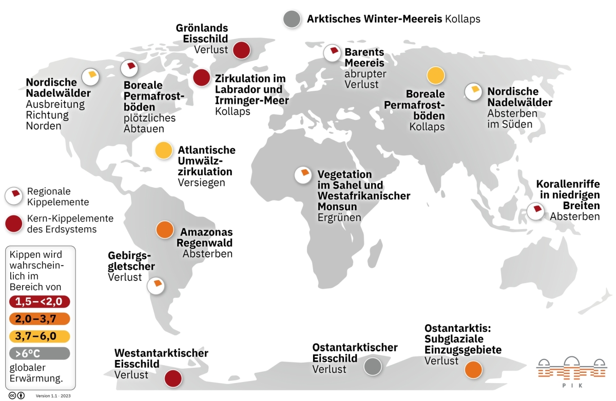 „Wenn die Belastung der globalen Klimasysteme dauerhaft zunimmt, kommt es zum Umkippen. Das kann weitreichende Folgen für Mensch und Umwelt haben“, so Rühr. Insgesamt 16 Teilelemente des Erd-Klimasystems wurden vom Potsdam-Institut für Klimafolgenforschung identifiziert, die bereits instabil werden, ihre Funktion verlieren und auf einen möglichen Kipppunkt zusteuern.