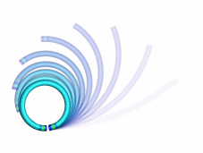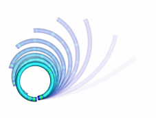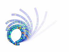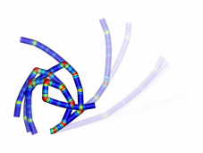 Zeitliche Abfolge einer stochastischen Simulation zum Biegen eines Drahts. Von oben links nach unten rechts nimmt der Durchmesser von 100µm auf 0,1µm ab. Die stochastische Simulation berücksichtigt die gefundene Häufigkeitsverteilung der Dehnungssprünge. Es zeigt sich, dass das Bilden eines Ringes mit abnehmendem Durchmesser durch die starke Lokalisierung der Verformung unmöglich wird.