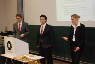 Beim Bearbeiten der Fallstudie mussten sich die zwölf Nachwuchsunternehmer-Teams an „Green Transportation“ orientieren: einem Prinzip, das den ökologischen Herausforderung begegnen will, ohne die Mobilität einzuschränken. Das Karlsruher Team „Deep Dive“ überzeugte mit seinem Gesamtkonzept für einen „grünen“ MP3-Player. Sebastian Walther, Heike Freund und Philipp Wunderlich setzten vor allem darauf, die Wertschöpfungskette möglichst umweltfreundlich zu gestalten: „Wir haben nach Möglichkeiten gesucht, die Transportwege bei Lieferung und Verteilung zu minimieren und damit den CO2-Ausstoß zu reduzieren“, beschreibt Walther die erfolgreiche Idee. Die umweltfreundliche Produktion – Recyclen und Wiederverwenden der Materialien – und eine auf ihr Produkt „GreenBeats“ zugeschnittene Marketingkampagne ergänzten das Konzept des Teams. „Dass wir den ersten Karlsruher ‚Heimsieg’ geholt haben, freut uns natürlich besonders“, sagt Deep-Diverin Heike Freund. Auf Platz zwei landete das Team der Kopenhagener Business School vor den Studierenden der Otto Beisheim School of Management aus Koblenz.