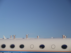 Über sieben Einlässe, die wie Igelstacheln aus dem Flugzeugrumpf herausragen, wird Atmosphärenluft angesaugt und zur chemischen Analyse in die in-situ Geräte an Bord geleitet. (Foto: Hermann Oelhaf, KIT)