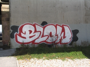 Ein Throw-Up ist ein einfaches, schnell produziertes, zweifarbiges bildhaftes Graffiti, bestehend aus Konturen (Outlines) und Füllungen (Fill-Ins). Es wird auch als „Quickpiece“ (oder abgekürzt als „Quickie“) bezeichnet. Wenn die Füllung in silberner Farbe gesprüht ist, spricht man von einem „Silverpiece“ (Abk. „Silver“) oder einem „Chrome“. (Foto: Universität Paderborn)