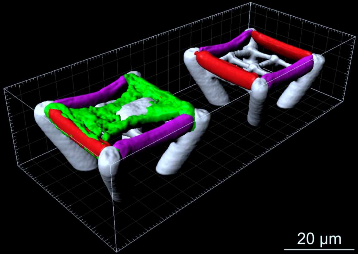 Dreidimensionale Mikrogerüste für die Kultivierung einzelner Zellen (Aktinfärbung in grün), die durch photochemische Prozesse mit zwei unterschiedlichen Proteinen (rot, magenta) gezielt funktionalisiert wurden (Foto: Benjamin Richter, KIT).