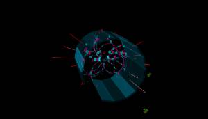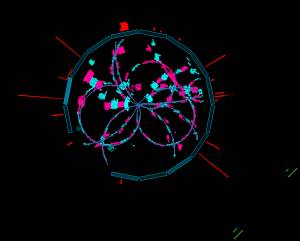 Die blauen Linien sind rekonstruierte Spuren, die magenta- und cyan-farbigen Kreise sind Hits in der Spurenkammer und die roten Histogramme Energiedepositionen im Belle II-Kalorimeter. Die grünen Boxen sind Hits in dem KL-Detektor (ein instrumentiertes Joch, um Myonen oder langlebige Kaonen nachzuweisen). (Fotos: KEK)