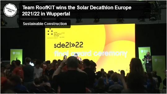 Am letzten Tag des Wettbewerbs waren die Disziplinen Architektur und Innovation ausschlaggebend dafür, dass RoofKIT bei der Finalzeremonie des Solar Decathlon Europe 21/22 am 24. Juni feierlich zum Sieger gekürt wurde. Auf dem zweiten Platz landete das Team VIRTUe aus Eindhoven; die Teams AuRA aus Grenoble und SUM aus Delft erreichten gleichauf miteinander den dritten Platz. Zu dem in Wuppertal und damit erstmals in Deutschland ausgetragenen, vom Bundesministerium für Wirtschaft und Klimaschutz geförderten Hochschul-Bauwettbewerb waren insgesamt 16 Teams aus elf Ländern zusammengekommen, um Solarhäuser mit neutraler oder sogar positiver Energiebilanz zu planen, zu bauen und zu betreiben.