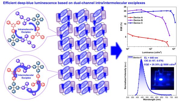 Zhen Zhang, Dehai Dou, Rongrong Xia, Peng Wu, Eduard Spuling, Ke Wang, Jin Cao, Bin Wei, Xifeng Li, Jianhua Zhang, Stefan Bräse, and Zixing Wang: Efficient deep-blue luminescence based on dual-channel intra/intermolecular exciplexes. Science Advances, 2023. DOI: 10.1126/sciadv.adf4060