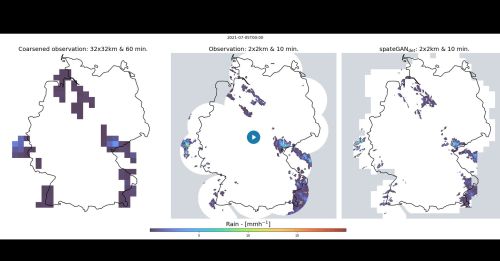 „Unsere Methode dient als Grundlage, um grob gerasterte Niederschlagsfelder auf eine Auflösung zu bringen, die der hohen raum-zeitlichen Variabilität von Niederschlag gerecht wird und die Untersuchung regionaler Auswirkungen erst ermöglicht“, sagt Julius Polz vom IMK-IFU. „Unsere Deep-Learning-Methode ist dabei um mehrere Größenordnungen schneller als die Berechnung solch hochaufgelöster Niederschlagsfelder mit numerischen Wettermodellen, die üblicherweise genutzt werden, um Daten von globalen Klimamodellen regional zu verfeinern.“ Die Methode generiere außerdem ein Ensemble verschiedener möglicher Niederschlagsfelder. Dies sei entscheidend, da für jedes grob aufgelöste Niederschlagsfeld eine Vielzahl an physikalisch plausiblen hochaufgelösten Lösungen existiert. Ein Ensemble ermögliche, ähnlich wie bei der Wettervorhersage, die damit einhergehende Unsicherheit genauer zu erfassen.